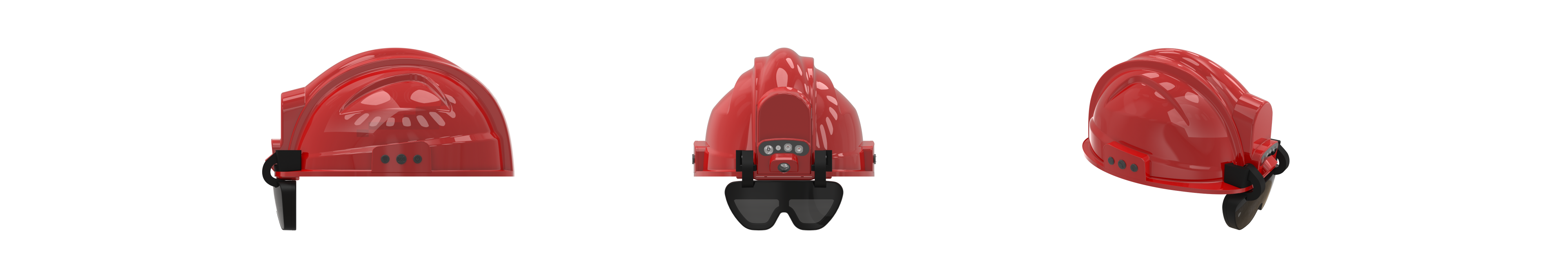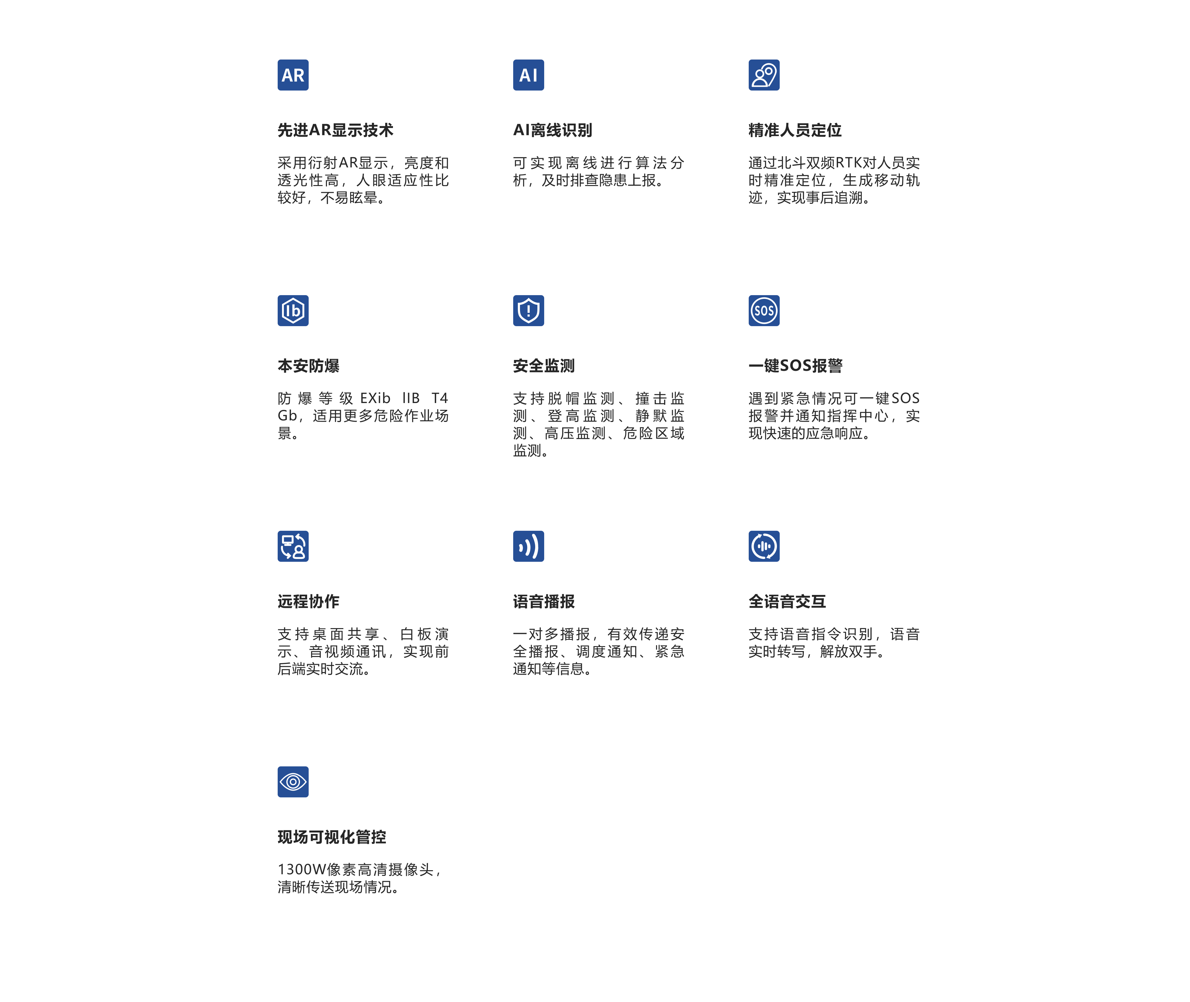 终端集成了AR显示模组和5G、WIFI、蓝牙等多种通讯方式,内置脱帽、静默、撞击等多种安全监测传感器和GPS/北斗多模定位芯片的智能穿戴防护设备。